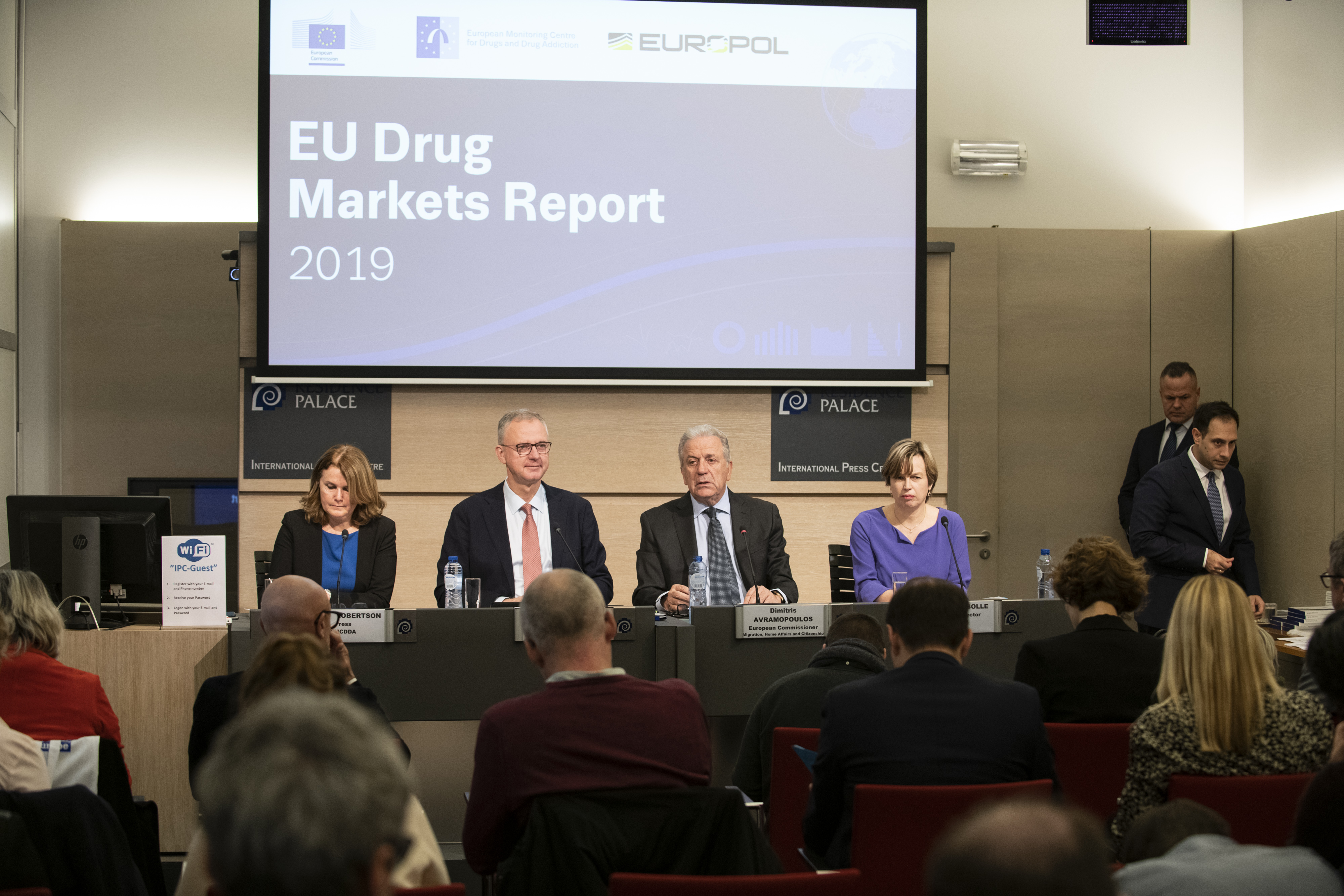 At the launch of the EU Drug Markets Report 2019 in Brussels. Picture shows (left to right): Kathryn Robertson EMCDDA press officer, EMCDDA Director Alexis Goosdeel, Dimitris Avramopoulos, European Commissioner for Migration, Home Affairs and Citizenship and Europol Executive Director Catherine de Bolle.