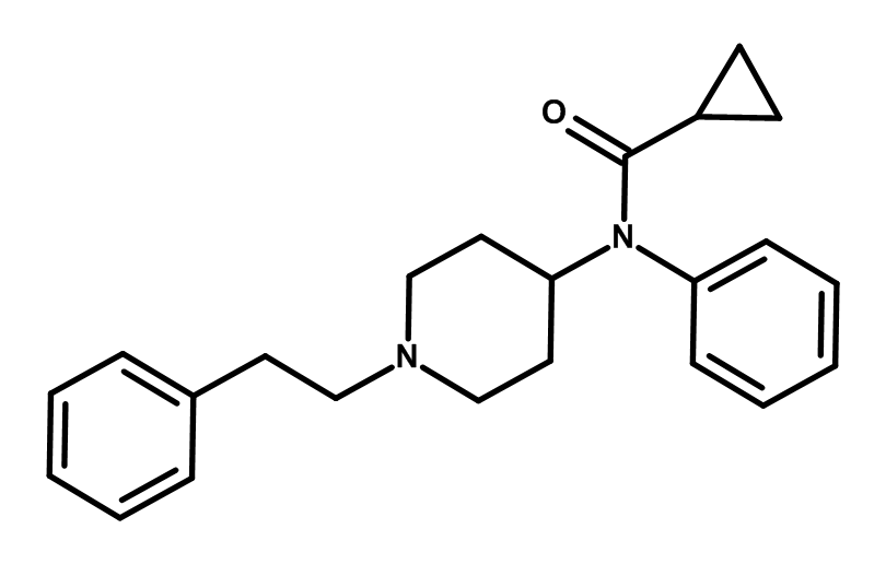 Molecular structure of N-phenyl-N-[1-(2-phenylethyl)piperidin-4-yl]cyclopropanecarboxamide (cyclopropylfentanyl).