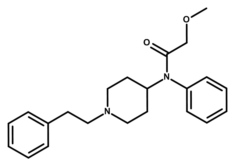 Molecular structure of 2-methoxy-N-phenyl-N-[1-(2-phenylethyl)piperidin-4-yl]acetamide (methoxyacetylfentanyl).