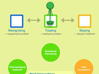 The green token above represents someone with a drug use problem. Each of the three squares in the top 'Recognising', 'Treating' and 'Staying' represent different stages on a journey along the path of treatment. When you move the token to a square, suitable interventions for that phase will be highlighted in the internventions circle on the right. The arrows show an important point: a user can move in both directions between different phases on the journey. You can learn more about each intervention by clicking on it.